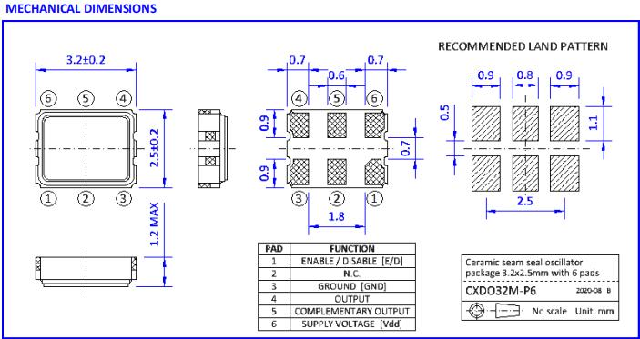 ●SMD封裝尺寸為3.2 x 2.5 x 1.0mm,帶有6個襯墊