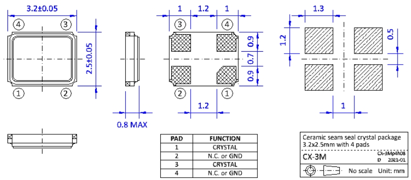 NKG晶振|S3M48.000F18M23-EXT|3225小體積晶振尺寸圖