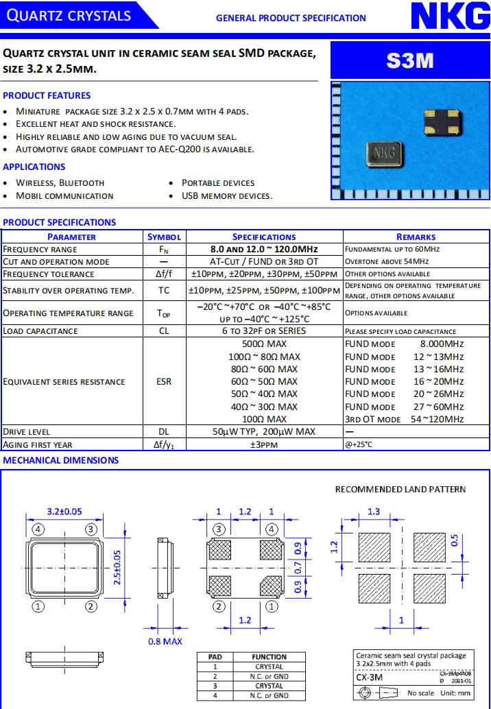 NKG晶振|S3M48.000F18M23-EXT|3225小體積晶振特點