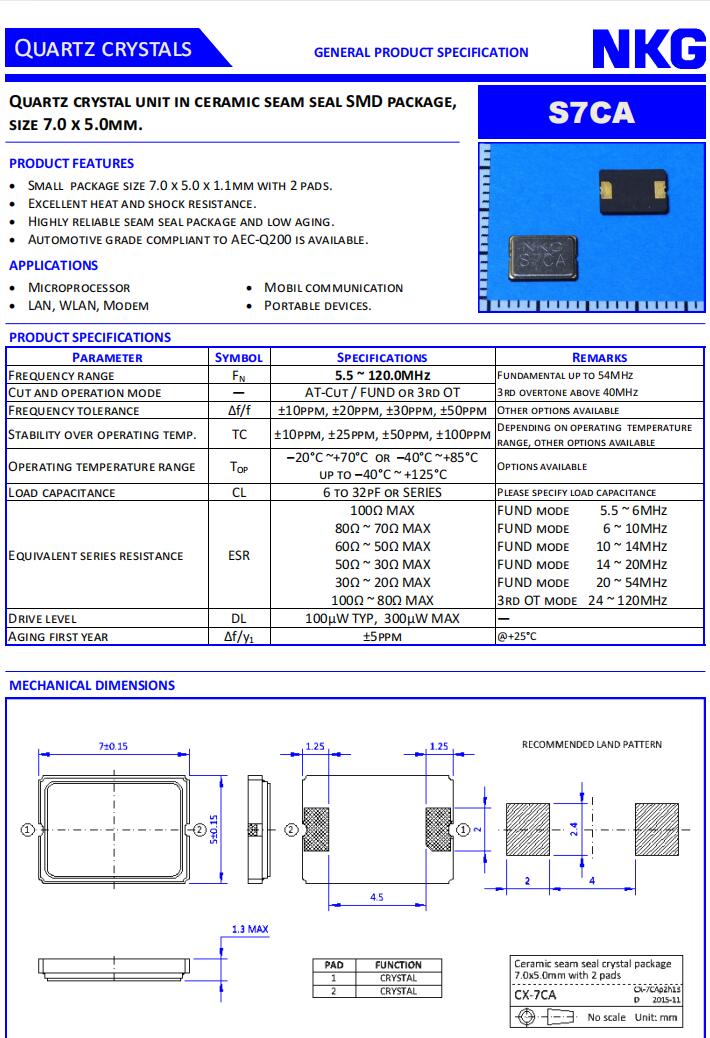 香港NKG晶振|S7CA40.000F20M23-EXT|7050無源晶振規格表
