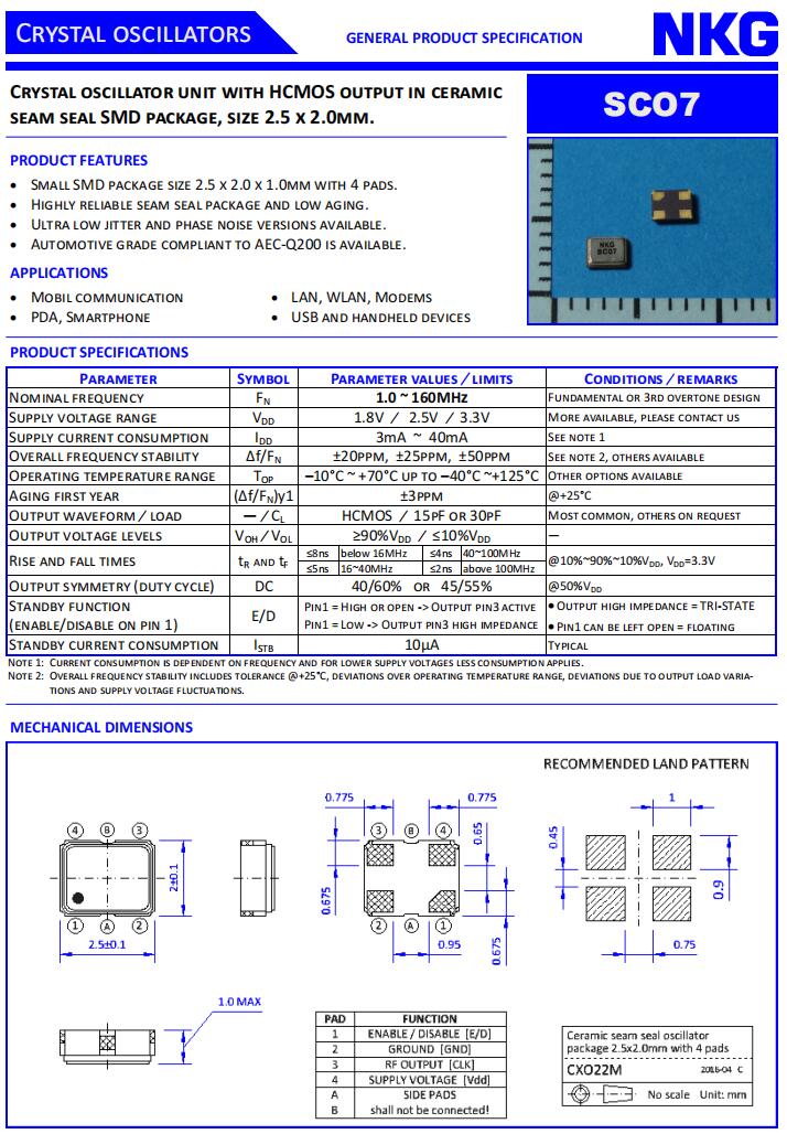 NKG晶振|SCO7-6-G-40.0000-WTS-EXT|2520mm晶振特點