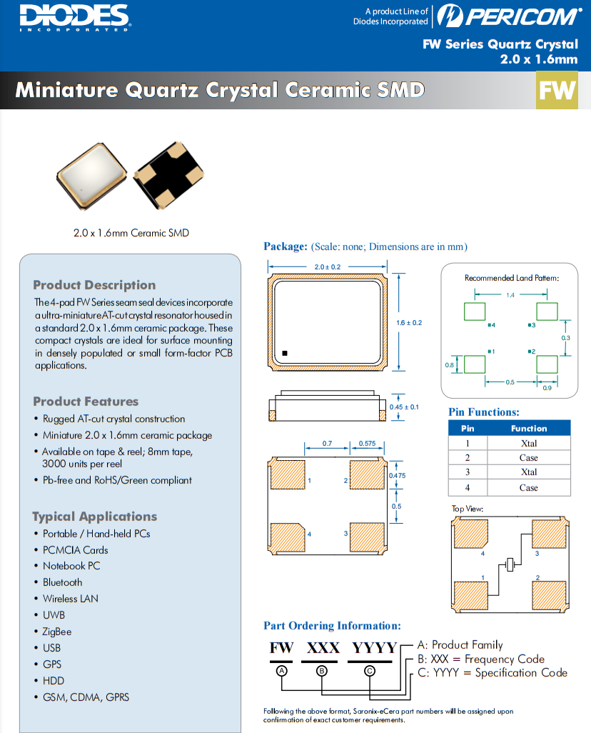 | FW1920001 | Diodes晶振 | FW | 19.2 MHz | ±20ppm | ±10ppm | 8pF |