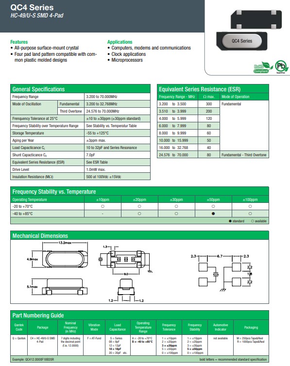 康泰克晶振,QC4晶振,HC-49/U-SMD晶振