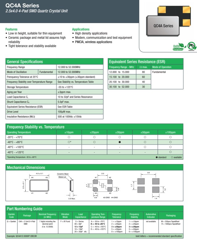 QANTEK晶振,QC4A晶振,4025四腳晶振小型貼片石英晶振,外觀尺寸具有薄型表面貼片型石英晶體諧振器,特別適用于有小型化要求的市場領域,比如智能手機,無線藍牙,平板電腦等電子數碼產品.晶振本身超小型,薄型,重量輕,晶體具有優良的耐環境特性,如耐熱性,耐沖擊性,在辦公自動化,家電相關電器領域及Bluetooth,Wireless LAN等短距離無線通信領域可發揮優良的電氣特性,滿足無鉛焊接的回流溫度曲線要求.