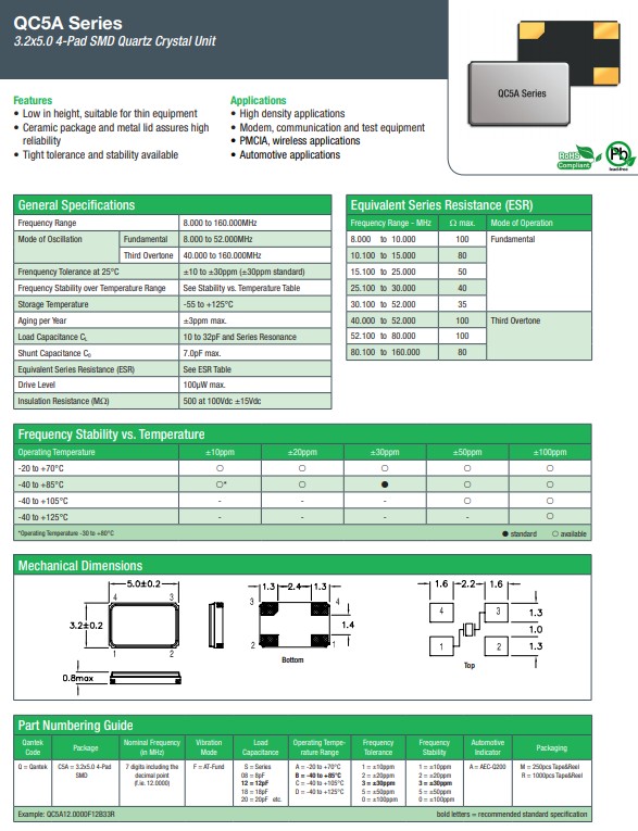 低頻晶振可從7.98MHz起對應,小型,超薄型具備強防焊裂性,石英晶體在極端嚴酷的環境條件下也能發揮穩定的起振特性,產品本身具有耐熱,耐振,耐撞擊等優良的耐環境特性,滿足無鉛焊接以及高溫回流溫度曲線要求,符合AEC-Q200標準.