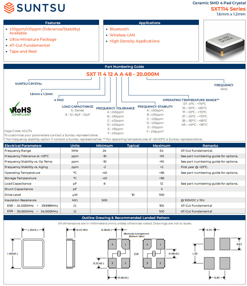 | SXT11410AA48-38.400M | 1.6X1.2 SMD (4 PAD) CRYSTAL | 10pF | ±50ppm | 38.400M |
