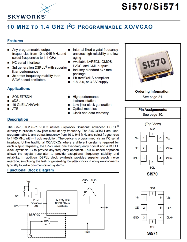| 571AMA000121DG | Skyworks Solutions Inc. | Si571 | 100 MHz | LVPECL | 3.3V | ±20ppm |