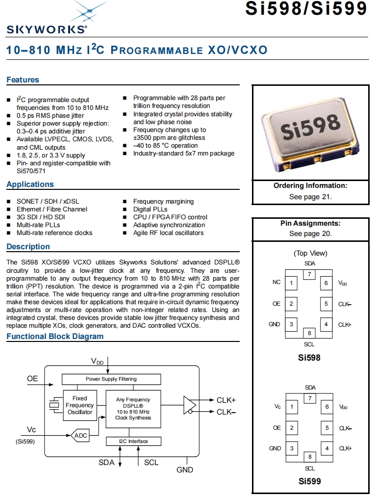| 598ACA000642DGR | Skyworks Solutions Inc. | Si598 | 100 MHz | LVPECL | 3.3V | ±20ppm |