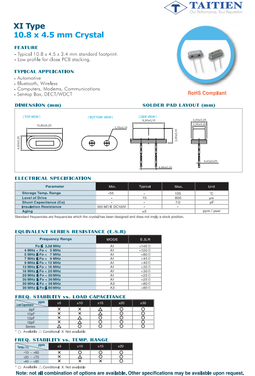 | XIHEELAANF-7.372800 | TAITIEN晶振 | XI | 7.3728MHz | ±30ppm | ±30ppm | 20pF |