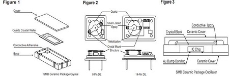 石英晶體單元包括一小條石英帶或一盤(pán)石英,根據(jù)用戶(hù)指定的諧振頻率,將其加工成確切的尺寸和厚度.石英鍍有導(dǎo)電電極,并安裝在密封的保護(hù)罩中(見(jiàn)圖1).電極通過(guò)玻璃對(duì)金屬的密封或通過(guò)SMD陶瓷封裝(見(jiàn)圖1)連接到穿過(guò)基座的引線.電極通過(guò)鍍層陶瓷連接到焊盤(pán).晶體單元通常與其他電路封裝在一起,以實(shí)現(xiàn)功能齊全的模塊,例如石英晶體振蕩器或復(fù)數(shù)濾波器.圖2和圖3說(shuō)明了簡(jiǎn)單的晶體振蕩器.由于晶體單元的性質(zhì),正確處理非常重要. 機(jī)械沖擊