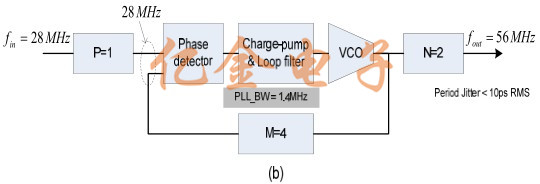 例如,考慮一個需要56的應用程序具有10ps RMS抖動的MHz時鐘晶振.圖2顯示兩種設計,一種使用標準的25MHz參考另一個使用非標準的28MHz參考來自可編程振蕩器.
