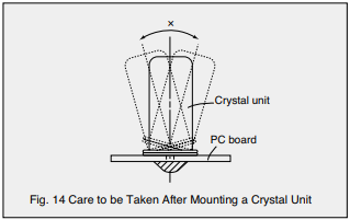 (3)安裝引線型晶振晶體單元時,我們建議設備應與PC聯系電路板和焊接方式,以防止疲勞和由于機械共振引起的引線斷裂(見圖。13)。