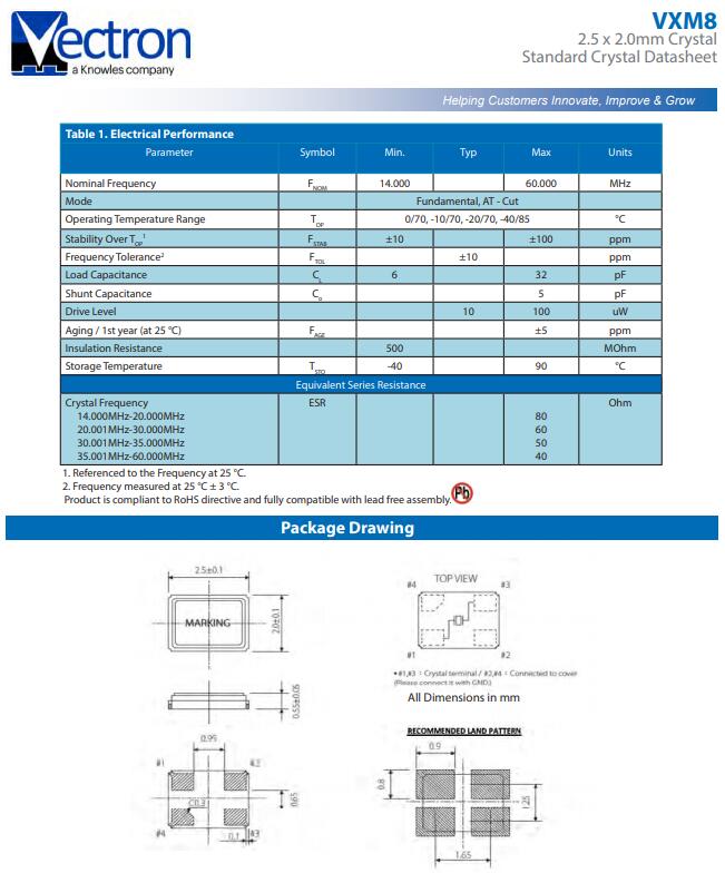 2、20MHz以下的晶體晶振基本上都是基頻的器件,穩定度好,20MHz以上的大多是諧波的(如3次諧波、5次諧波等等),穩定度差,因此強烈建議使用低頻的器件,畢竟倍頻用的PLL電路需要的周邊配置主要是電容、電阻、電感,其穩定度和價格方面遠遠好于晶體晶振器件;維管石英晶體,VXM8晶振,2520四腳晶振