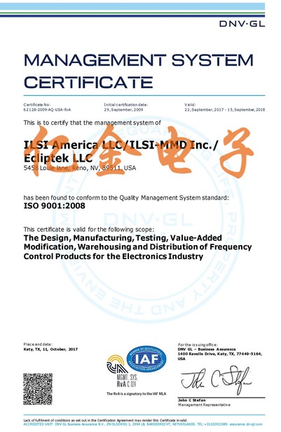 日蝕晶振獲2018年ISO9001國際質量保證書