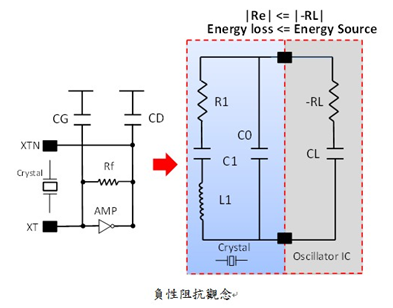 石英晶體共振子的兩端往振蕩電路看過去,排除共振子以外的所有阻抗特性質(zhì)總和,振蕩電路上必須提供足夠大的增益來補償共振子共振時的機械能損耗,也就是放大器為一個能量源,若負性阻抗的能量源大于振蕩電路的損耗時,能源回路為平衡狀態(tài)此回路為穩(wěn)定振蕩,負性阻抗不是產(chǎn)品規(guī)格參數(shù),但卻是振蕩線路設(shè)計時很重要的性能指針.