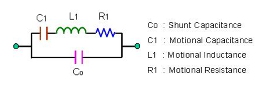 就是將石英晶體共振子轉(zhuǎn)換成振蕩頻率附近的Butterworth-Van Dyke (BVD)等效電路. 在這個(gè)圖中, 有四個(gè)主要參數(shù) : 靜態(tài)電容-Co, 動(dòng)態(tài)電容-C1, 動(dòng)態(tài)電感-L1及動(dòng)態(tài)電阻-R1.