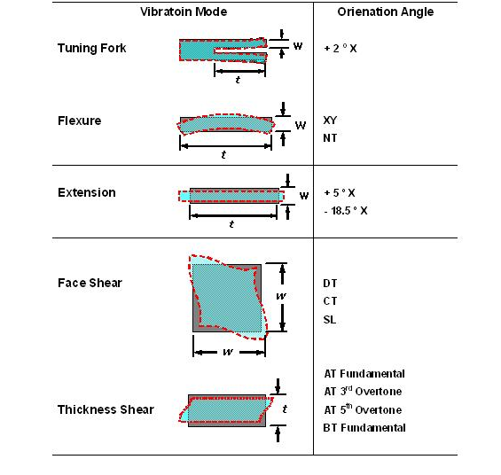經由不同的石英切割角度及不同電極型狀的電場效應, 石英芯片展現了各種不同的振動模態. 以經常產生的振動模態可以概分為擾曲模態(flexure mode), 伸縮模態(extension mode), 面剪切模態(face shear mode) 和 厚度剪切模態(thickness shear mode). 這幾種振動模態以簡單的方法在表一中可以看到. 在實際狀況中, 石英芯片并不是一定祇有單一種振動模態, 而可能有多種模態同時存在在一個石英芯片的振蕩中, 經由適當的設計, 可以壓制其它不希望產生的振動模態(unwanted mode), 來達到主要振動模態的最佳化.