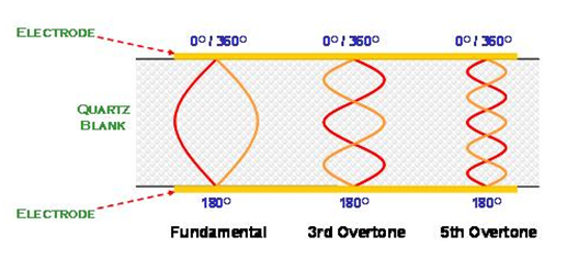 基本波振蕩及倍頻振蕩模態( Fundamental and Overtone Vibrations Mode):在AT切割角度的石英晶體共振子主要是以厚度剪切振蕩模態存在. 石英晶體在共振時, 除了基本波振蕩之外, 高階的倍頻共振也與基本波振蕩同時存在于石英晶體的電極區域之間. 但是, 由于壓電材料的電極是電氣相位相反的振動環境, 所以, 祇有奇數倍(odd number)的高頻倍頻可以發生, 偶數倍(even number)的倍頻共振在石英晶體共振子是不會存在的.