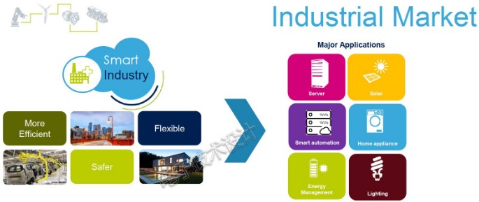 針對工業(yè)4.0的功率器件總體上包括高電壓功率MOSFET、低電壓功率MOSFET、IGBT、碳化硅MOSFET、氮化鎵、功率RF、功率模塊等覆蓋相對較廣的各種產(chǎn)品.
