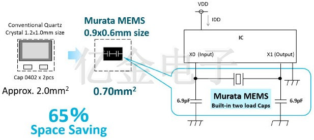 32.768kHz MEMS諧振器采用晶圓級芯片規模封裝(WLCSP)使用在與由相同材料制成的半導體IC芯片安裝時具有高親和力的硅材料.這使得村田晶振能夠嵌入IC中.還可以支持傳遞模塑和引線鍵合安裝.