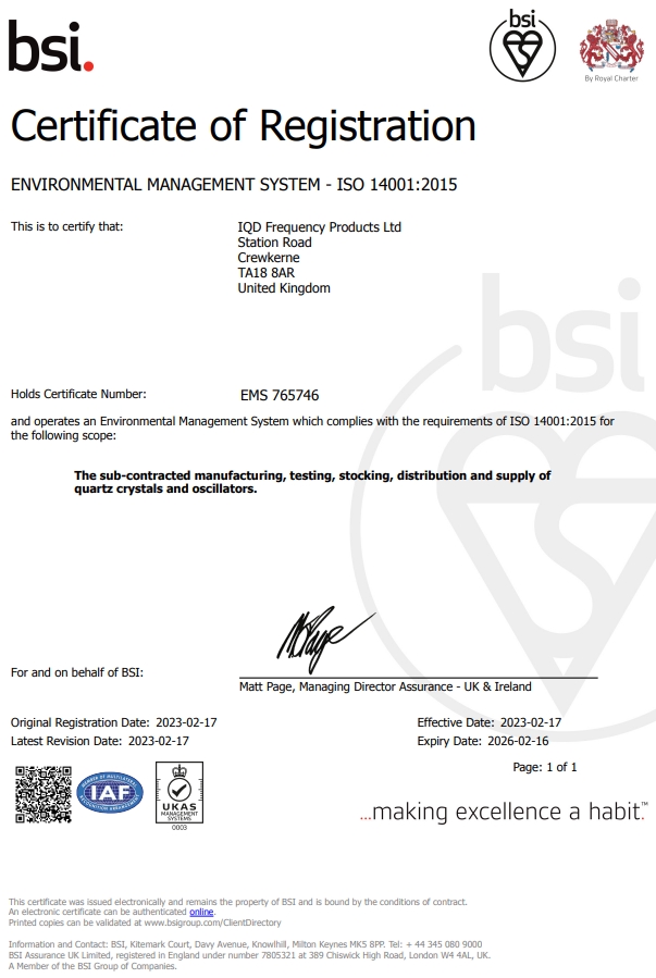 最初于1988年獲得BS 5750認(rèn)證,IQD所有的設(shè)計、制造和測試設(shè)施都通過了ISO 9001:2015認(rèn)證。我們的質(zhì)量管理體系不斷改進和調(diào)整,以滿足國際標(biāo)準(zhǔn)和客戶的要求。 質(zhì)量是IQD晶振成功的基石,我們?yōu)槲覀兊囊幌盗蓄l率控制產(chǎn)品提供全面的質(zhì)量解決方案。我們的質(zhì)量管理體系確立了適當(dāng)?shù)睦砟?,以確保公司及其員工遵守文件規(guī)定的程序,并通過提供高度誠信的產(chǎn)品和服務(wù)來保持客戶滿意度。