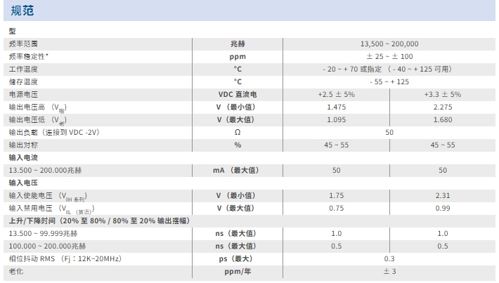 庫存頻率包括25 MHz、100 MHz、125 MHz、155.52 MHz和156.25 MHz。 頻率范圍為13.50 MHz至156.25 MHz,頻率穩定性范圍為±25 ppm至±100 ppm,年老化率為±3 ppm。 S2A還提供多種溫度選項,包括-20°C至70°C; -40°C至85°C; 和-40°C至125°C。