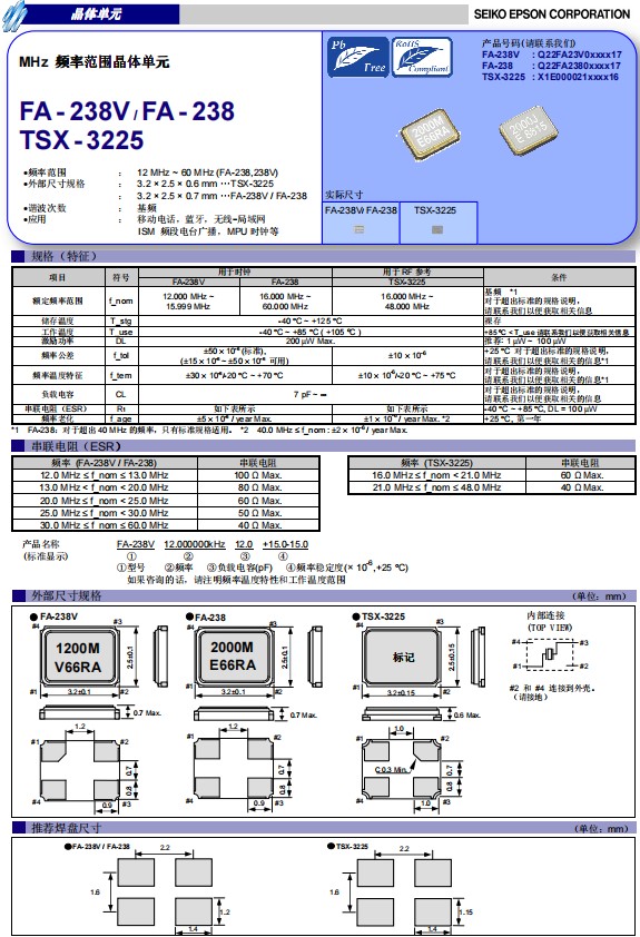 日本進口愛普生晶振型號TSX-3225,是一款小體積晶振尺寸3.2x2.5mm四腳貼片晶振,無源晶振,石英晶體諧振器,頻率范圍16MHz至48MHz,工作溫度范圍:-40℃至+85℃。具有高精度,小體積輕薄型,耐熱及耐環境特性,被廣泛用于移動電話,家用電器,智能家居,藍牙,無線-局域網,ISM頻段電臺廣播,MPU時鐘等領域。