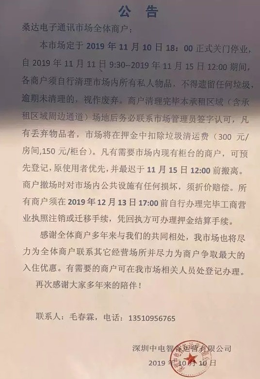 如今,桑達電子通訊市場即將停業,桑達電子通訊市場各個出入口均貼了《公告》,宣布將在11月10日正式停業.該《公告》始發時間是2019年10月10日,一個月后,桑達電子通訊市場將正式停業清場.