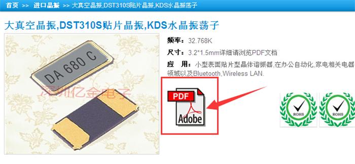 第四步,點擊之后會跳轉到DST310S石英晶振產品詳細頁面,從介紹中我們可以看到頻率,尺寸和應用,從尺寸中我們可以看到是符合要求的3.2*1.5mm,這時我們大致可以確認客戶要找的就是這顆料,為了更利于客戶選定產品我們官網上的每一個晶振產品都有放上PDF規格書,我們可以免費下載了解更多詳細參數.