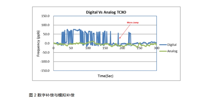 接下來,我們將看一個繪圖圖,該圖顯示了數字補償與模擬補償在溫度范圍內的影響。這將直觀地顯示我們之前討論的數字補償中的頻率跳躍或微跳躍。視覺效果很好地描述了模擬補償在穩定頻率和減輕微跳躍方面的積極影響。下面的藍色數字圖清楚地顯示了應用數字校正時出現的顯著頻率跳躍。micro-jumps 足夠大,足以導致依賴于此 clock的敏感電子設備出現問題。綠色模擬圖顯示了更線性的補償,幾乎沒有微跳轉。