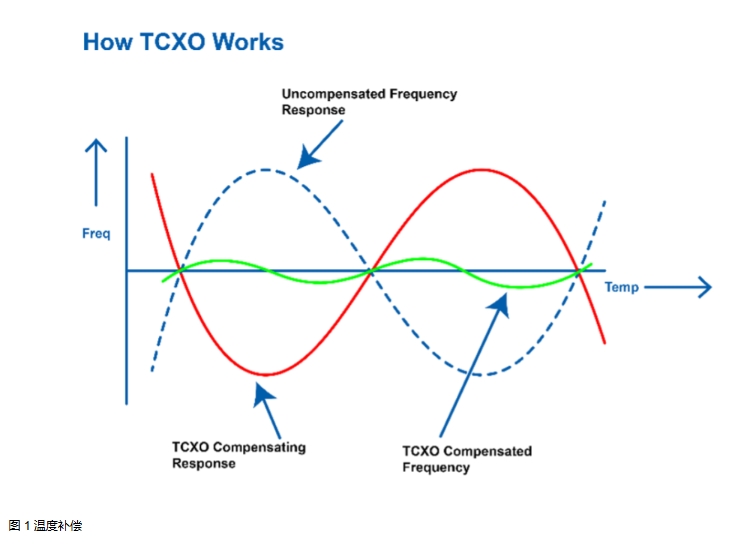 溫度補償是一種校準系統性能以補償溫度變化影響的方法。它可以顯著減少由溫度波動對石英晶體引起的頻率漂移量。它通過施加控制電壓來調整輸出頻率來實現這一點。溫度反饋通過 NTC 熱敏電阻提供,它告訴 ASIC 要向控制電壓增加多少補償。通過持續監控和更新輸出頻率,TCXO 可以保持非常低的 PPM 甚至 PPB 穩定性。