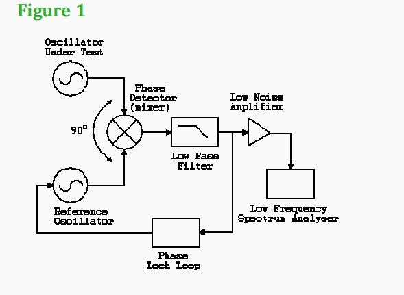 下一個考慮因素是用于進行測量的測試設備。相位噪聲的測量是通過將被測振蕩器正交鎖定到參考振蕩器來實現的,如圖1所示。正交鎖定的效果是去除載波頻率,只留下非相位相關的噪聲分量。低通濾波器不是用來過濾相位噪聲的,而是用來去除2x頻率分量的。相位檢測器(混頻器)產生兩個輸入頻率的和(2x)和差(我們只對差感興趣,即沒有載波頻率的部分)。低噪聲放大器可以根據低頻頻譜分析儀的分辨率進行切換。