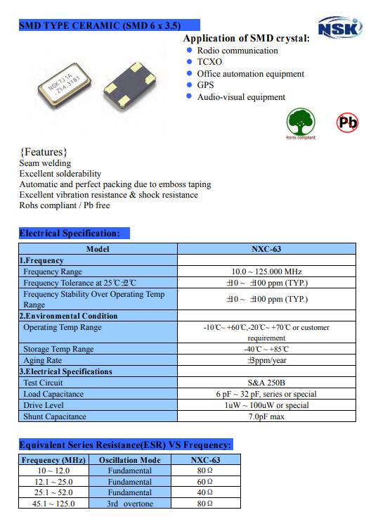 NSK晶振,NXC-63晶振,6035四腳晶振貼片石英晶體,體積小,焊接可采用自動貼片系統,產品本身小型,表面貼片晶振,特別適用于有小型化要求的電子數碼產品市場領域,因產品小型,薄型優勢,耐環境特性,包括耐高溫,耐沖擊性等,在移動通信領域得到了廣泛的應用,晶振產品本身可發揮優良的電氣特性,滿足無鉛焊接的高溫回流溫度曲線要求.